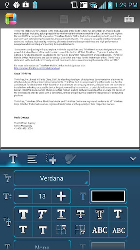 Ҩ View, edit create documents needed to to PC Ҩ Create professional diagrams rich style finger tip Ҩ Apply transition effects run animations presentation Ҩ Simple intuitive user interface optimized smartphone tablet Ҩ Main Features: Ҩ Fast to open scroll Ҩ Mobile-friendly edit menu Ҩ Insert various objects (Support to insert video clip) Ҩ High render quality compatibility Ҩ annotation, memo highlight PDF file Ҩ Support to save PDF Ҩ Optimized file management mobile devices Ҩ documents templates Ҩ Online storage (ThinkFree Online, Box.net, Google Drive) Ҩ * File Manager Ҩ Optimized file management UX it easy to perm common tasks such multi-selection, open, rename, search, copy, delete, send. Quick easy access to recent files list enables to find recently edited documents conveniently. Ҩ * Template Download Ҩ ThinkFree Mobile Pro supports a PC- experience user not create documents templates b also download more than 40 kinds of extra templates from an online server free. Ҩ * Online Storage Ҩ Documents be uploaded downloaded via b storage services such ThinkFree Online, Box.net Google Drive. fure, various cloud services will also be linked through Cloud Connector synchronizing content various devices platms. Ҩ ThinkFree Mobile Pro also connected to Box.com storage (OneCloud), enabl users to create, open, edit share documents anytime anywhere. Ҩ * Edit Menu Ҩ Intuitive UI optimized UX provide a PC- edit experience, mak it easy convenient to perm edit tasks. Ҩ * Insert Objects Ҩ option to insert various objects allows to create unique documents. insert tables, shapes, draws video clips best UX. A library of 23 images, 36 shapes, 8 line styles, 12 charts helps create professional look documents. Ҩ * Render Quality Ҩ Compatible respect to 3D shapes, Pro provides high quality figures renders various object effects such neon, shadow, reflection. It also displa smart art compatible MS Office. Ҩ Advanced Features: Ҩ Dynamic & visual effects Ҩ Insert video clips Ҩ Slide note Ҩ Insert annotations PDF Ҩ Numeric keyboard & easy culation Ҩ PC- functions Ҩ Various fonts Ҩ Integrated quick t-vier Ҩ Extra features Ҩ * Animation & Transition effects Ҩ Pro supports a variety of animation effects such entrance, fly , pinwheel etc. Slides animations are displayed a star (★). Adding a transition effect (24 kinds of effects) also easy using contual menu slides thumbnail view. Ҩ * Insert Video Clips Ҩ Show supports multimedia effects to grab an audiences attention by deliver dynamic presentations. Ҩ * Slide Note Ҩ Show supports slide notes allow to annotations a stylus pen finger dur a slide show. Ҩ * Insert PDF Annotations Ҩ PDF vier supports highlight important content annotations using shapes, comments lines emphasis. Ҩ * Numeric Keyboard & Easy culation Ҩ c provides accurate complex functions various numeric keyboards. It also supports function search, which similar to MS Office feature. Ҩ * Various Fonts Ҩ A variety of fonts corresponding to MS Office are provided, enabl to select exactly want to use documents. Ҩ * Integrated Quick t Vier Ҩ If need to open read a large t heavy document, ThinkFree Mobile Pro will quickly change to a t vier mode. Ҩ * Hyperlink, Dictionary, TTS Ҩ Insert hyperlinks to objects helps to support documents more detailed explanations. also search exact mean of words using built- dictionary listen to words via TTS (t-to-Speech) feature. Ҩ 's t version: (Updated : Sep 7, 2012) Ҩ Now supports Jellybean! (2x ~ 3x faster when loading documents) Ҩ Added options to download fonts Ҩ Several bug fixes Ҩ Required Android O/S : 4.0+ Ҩ